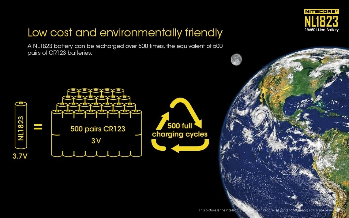 The Nitecore NL1823 is an 18650 type battery with 2300 mAh capacity.