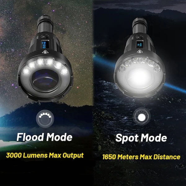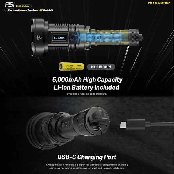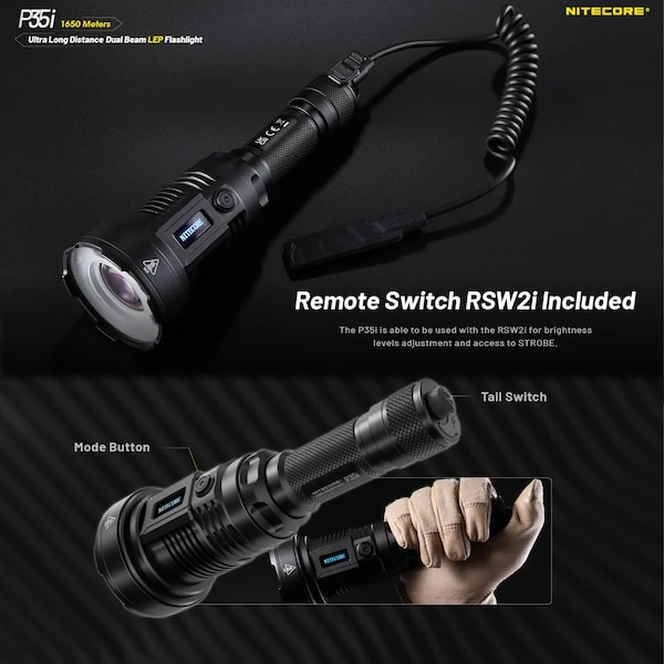 The Nitecore P35i LEP flashlight is a culmination of the latest LEP technology combined with multi-LED boosting to create the most powerful flashlight ever. Its central LEP module creates a spotlight beam that can reach up to 1,804 yards, longer than 18 football fields! Combining the six surrounding flood LEDs, it produces a 3000 lumen max beam that covers both areas closeby and faraway. In your palm is a searchlight that can reach over a mile in distance, great for hunting, search and rescue or spelunking.The P35i is USB-C rechargeable with a high capacity 5000mAh battery included. Built-into the side of the P35i is an OLED panel giving you detailed battery level readings, remaining runtimes, mode readouts, and more. The protected USB-C port can also be used to connect the included RSW2i pressure switch for remote control when the flashlight is mounted. The P35i is made from durable aero grade aluminum alloy and is rated IP68 waterproof, ready for outdoor adventures.