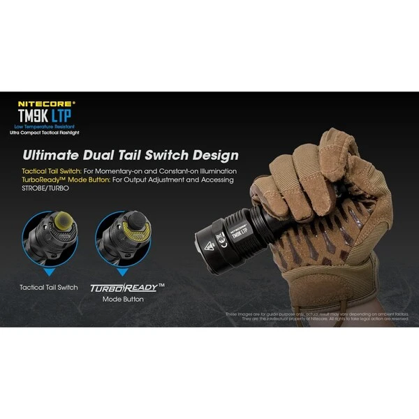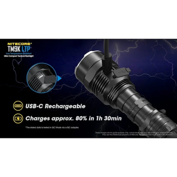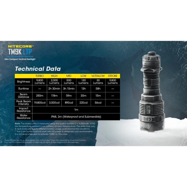 The Nitecore TM9K LTP is a specialized cold resistant variant of the popular TM9K TAC for the toughest adventures. The LTP comes with the same 9,800 lumen max power with a beam that can reach up to 306 yards. A unibody billet aero grade aluminum frame combined with a cold resistant battery that can withstand up to -40° C/F temperatures allow the TM9K LTP to operate in the harshest climates. The Turbo Ready dual button design supports single-hand operation and cycles through the four brightness levels. You can also lock out the flashlight to prevent it from accidental activation when it is not in use. The upgraded tactical ring allows for a stale cigar grip and acts as a functional roll stop.The Nitecore TM9K LTP is USB-C rechargeable, and comes with a charging cable included. Powered by a special built- in Li-ion battery that can operate in up to -40°C/F way beyond the freezing point of water. This is the flashlight you take to climb Everest, or explore the arctic circle. The LTP version of the TM9K TAC comes with the same (QC) quick charge technology to fast charge your battery via USB-C. You can also lock out the flashlight to save the battery and prevent accidental activation when not in use.