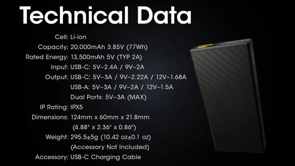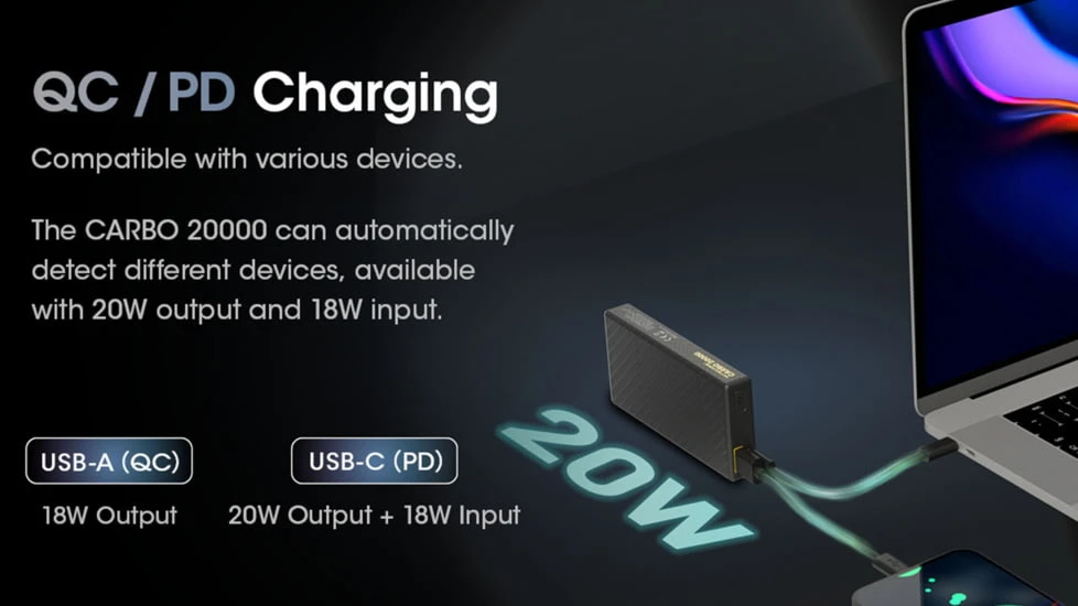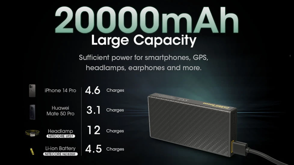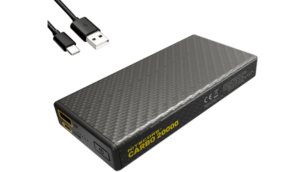 The Nitecore Carbo 20000 is a lightweight high capacity 20000mAh power bank designed for outdoor use. It weighs only 10oz. Yet, it still has enough power to charge the latest phone six times over! The Carbo 20k has USB-A and USB-C dual ports. A USB-C QC port is an in-and-out port for both recharging of the power bank and 20W QC charging of electronics. The USB-A port is capable of a 18W QC output, and can run at the same time as the USB-C port. For delicate devices such as bluetooth headphones and smart watches, the Carbo 20000 has a one-touch low current mode. Built with a unibody carbon fiber shell, the Carbo 20000 is highly resistant to puncture, abrasion, and drop up to 1.5 meter. Additionally, it is IPX5 rated water resistant, and provides safeguards against short-circuit, overcharge, over-discharge, and overheat. This is a must- have for road warriors, outdoor enthusiasts, campers, first responders, and more, and an essential for emergency kits, or bug-out-bags.![]()