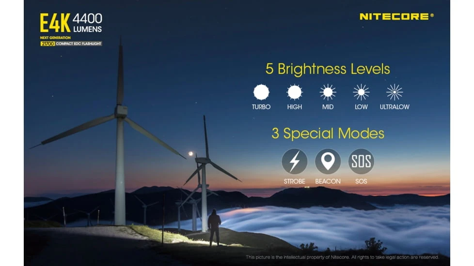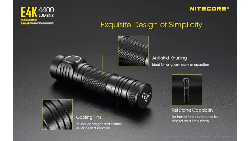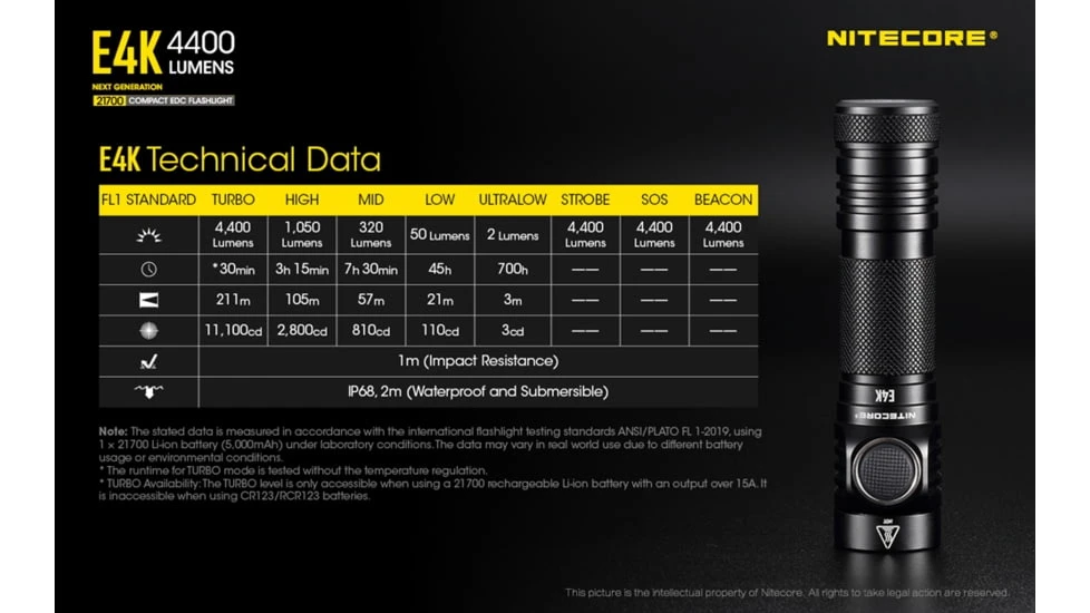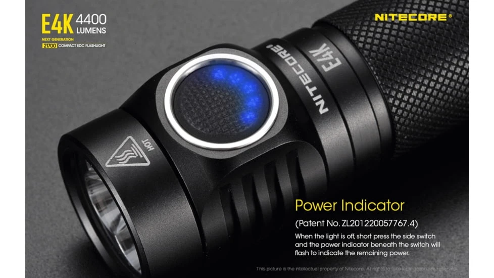 The Nitecore E4K is the most powerful EDC flashlight youve ever had. Weighing in at only 2.82 ounces and measuring less than 5 inches in length, the E4K radiates 4400 lumens for up to 230 yards. Paired with the included fast charging USB-C rechargeable 5000mAh NL2150HPR battery, this light can run for up to 30 days on ultralow mode, ensuring you have enough light for any activity. Whether you need a compact light for trekking, camping, or precautionary safety, the Nitecore E4K has you covered. Use the convenient side switch to power the light on and off, or press and hold to cycle among five brightness levels and 3 special modes (SOS, beacon, and strobe). The mode selection is memorized so you can turn the light on in your favorite mode. Use the included two-way clip to attach the light to any belt, vest, or pocket. With an IP68 waterproof rating, 1 meter impact resistant rating, and Advanced Temperature Regulation (ATR) technology, the Nitecore E4K is set to become anyones best safety companion for outdoor activities.![]()