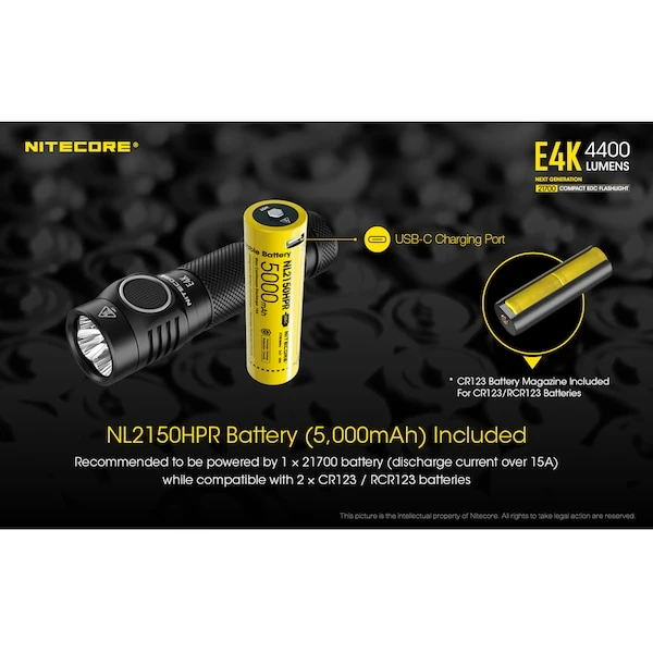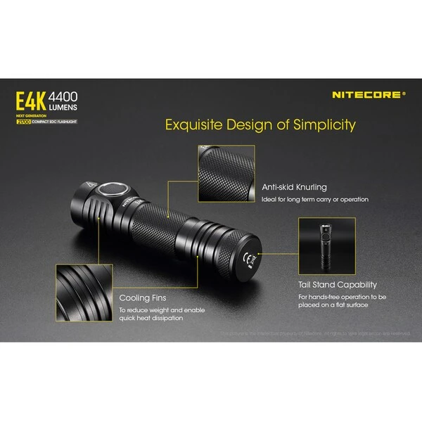 The NITECORE E4K is the most powerful EDC flashlight you’ve ever had. Weighing in at only 2.82 ounces and measuring less than 5 inches in length, the E4K radiates 4400 lumens for up to 230 yards. Paired with the included fast charging USB-C rechargeable 5000mAh NL2150HPR battery, this light can run for up to 30 days on ultralow mode, ensuring you have enough light for any activity.Whether you need a compact light for trekking, camping, or precautionary safety, the NITECORE E4K has you covered. Use the convenient side switch to power the light on and off, or press and hold to cycle among five brightness levels and 3 special modes (SOS, beacon, and strobe). The mode selection is memorized so you can turn the light on in your favorite mode. Use the included two-way clip to attach the light to any belt, vest, or pocket. With an IP68 waterproof rating, 1 meter impact resistant rating, and Advanced Temperature Regulation (ATR) technology, the NITECORE E4K is set to become anyone’s best safety companion for outdoor activities.