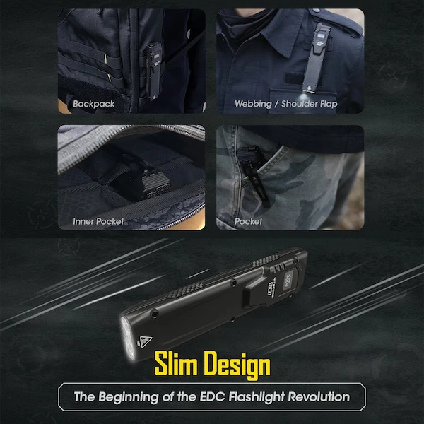 - •FLAT SHAPE EDC FLASHLIGHT – Designed to easily carry in pocket, the EDC27 is 44% thinner than round shape flashlights with a strong clip