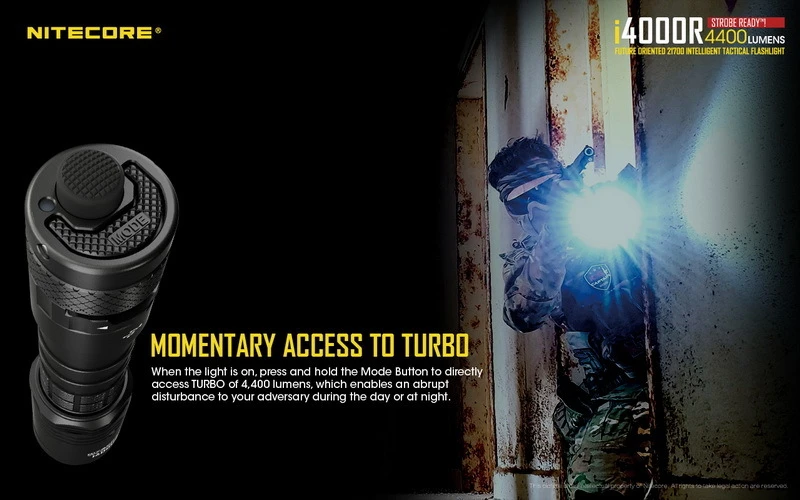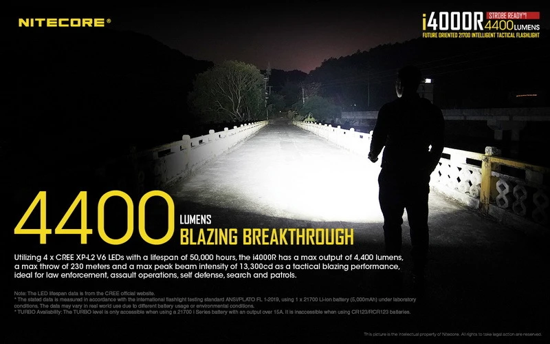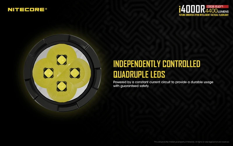 Made with law enforcement and military personnel in mind, the NITECORE i4000R draws on the latest technology to deliver an impressive 4400 lumen max output at 230 meters of reach. Enjoy single-handed operation with dual tail switches capable of momentary access and quick access to turbo and strobe. Press and hold the mode switch to access the strobe. Easily cycle through 4 brightness levels by short pressing the mode button while the light is on. Mode memory ensures that the same output is activated without surprise when the flashlight is turned back on.