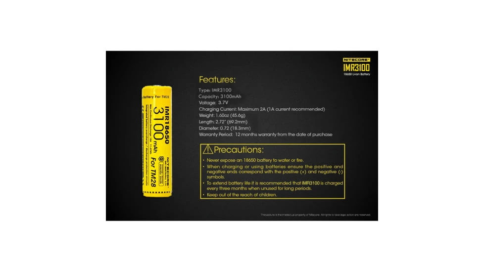 The NITECORE IMR3100 is a high-performance battery designed to power 18650 compatible high drain devices like your favorite flashlights, lanterns, headlamps, and more. We love to pair it with the NITECORE TM28, EC23 and Concept 1 flashlights.![]()