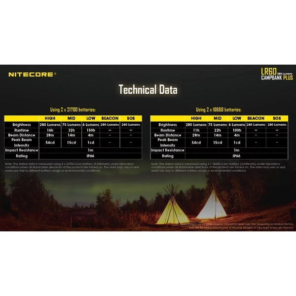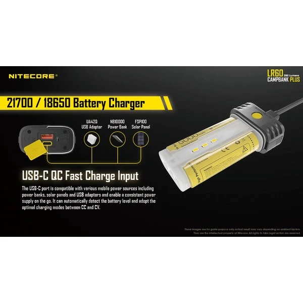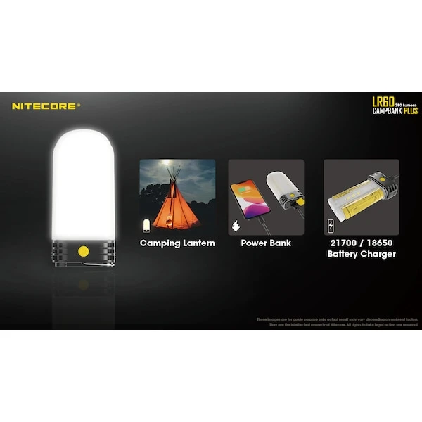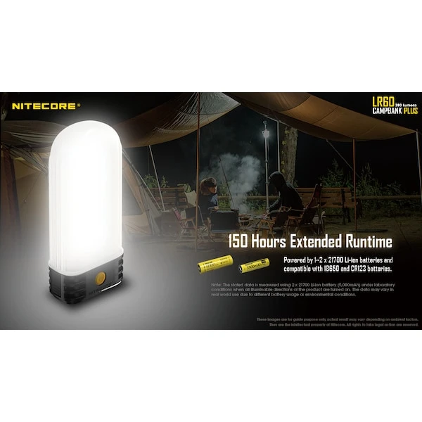 The NITECORE LR60 is a slim profile portable lantern that pushes out up to 280 lumens of high CRI light perfect for camping and outdoor activities. This ultra compact lantern is your go-to portable companion providing: multiple lighting options, charging, and discharging all in one. The LR60 comes with three different brightness settings which can be adjusted to multiple illumination directions to provide you just the right amount of light in any situation as well as saving power. Stand it on a table and use the forward lighting while reading, or use the hanging loop or magnetic base to position the LR60 wherever you please.The LR60 is much more than just a lantern. When equipped with two Nitecore 21700 batteries, the LR60 can be your mobile power station! It comes with a USB output port to charge your electronic devices like iPhones, Androids, tablets, batteries, and more. Upgraded to USB-C, the LR60 can recharge in no time with QC quick charge technology. No 21700? No problem, it even accepts 18650 batteries. You can even use the lantern while charging it at the same time. The LR60 is the best mobile, all-in-one solution for lighting and power for the outdoor enthusiast.
