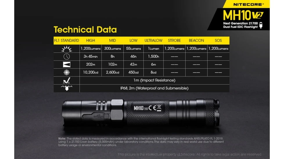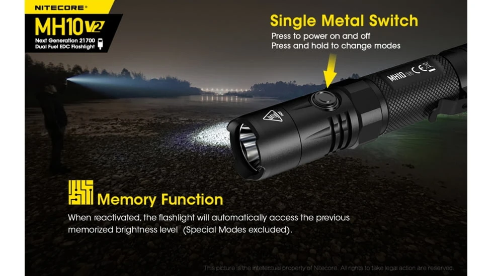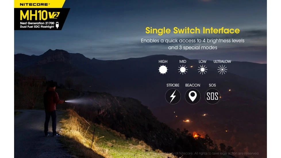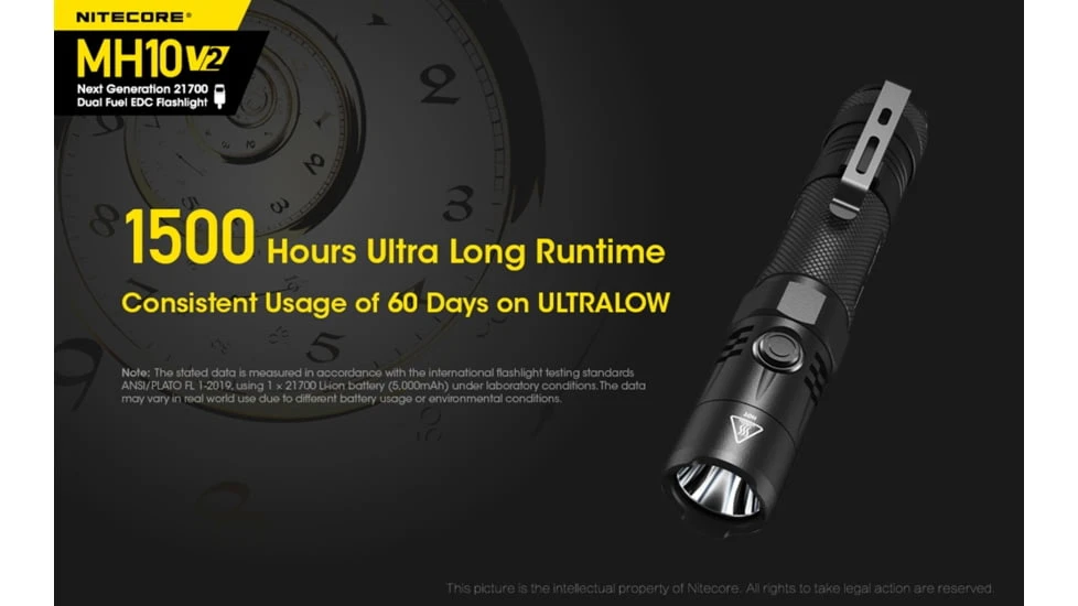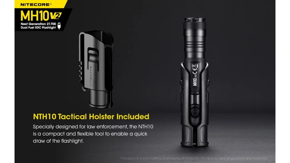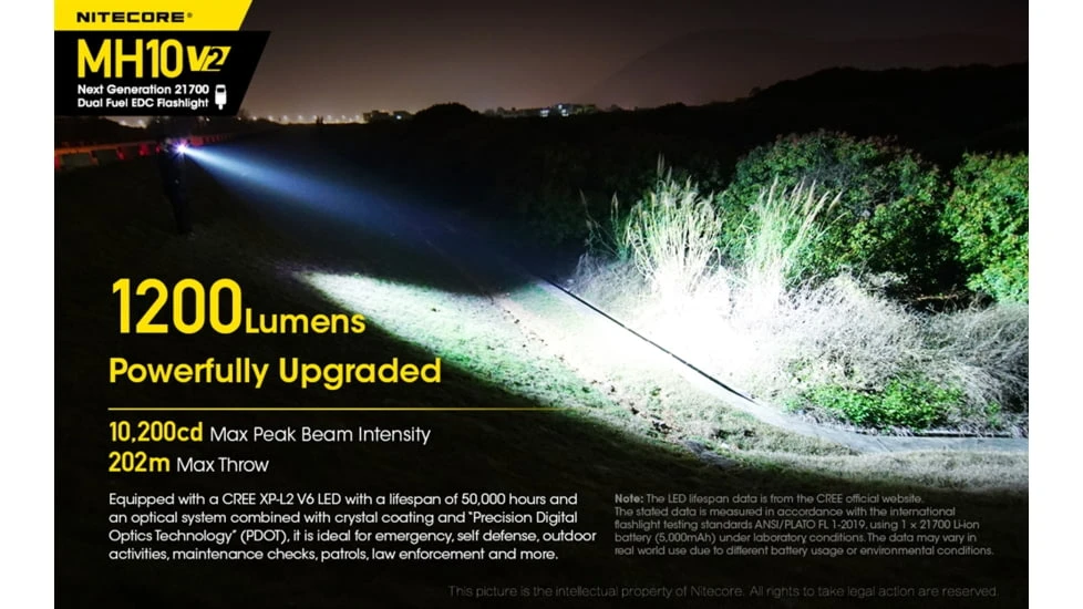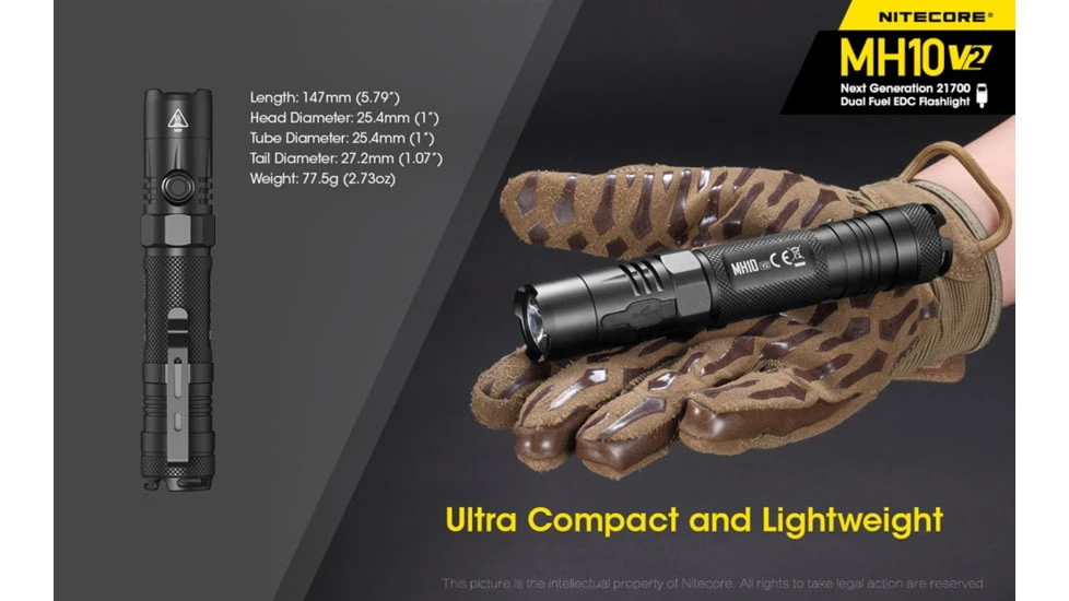 Triple the runtime and 20% brighter, yet still compact with more carry options, the Nitecore MH10 v2 is the quintessential upgrade of the classic EDC flashlight MH10. The 1200 lumen output at 220 yards of throw is a culmination of years of engineering and design. Count on it’s 3 hours and 45 minutes of runtime on turbo to accomplish all of your tasks with time to spare. At just under six inches in overall length, it remains a solid choice as a duty light or EDC flashlight with the included durable hard holster, pocket clip and lanyard.![]()