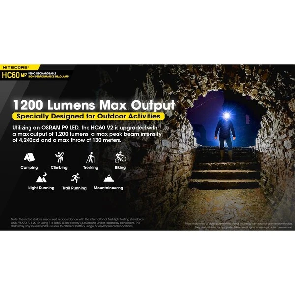 The Nitecore HC60 v2 headlamp takes everything we love about the Nitecore HC60 and makes it brighter, easier to use and faster to charge. It increases the max output to 1200 lumen, reaching up to 142 yards. Its 100° degree wide angle flood beam covers your entire field of vision. This makes the HC60 v2 an ideal headlamp for camping, running, trekking, biking, or any outdoor activities. No more fumbling with multiple switches in the dark. Hold the switch to power on and off. When the headlamp is on, tap the switch to cycle through different brightness levels and modes. The setting is memorized even after you turn off the headlamp.The HC60 v2 headlamp comes with an 3400mAh high capacity 18650 battery that supports an exceptional 680 hours of runtime on ultra low. You can fast charge the headlamp via its USB-C charging port. It is comfortable to wear with a secure rear pad and silicone grip strip on the headband. With the quality you can trust from Nitecore brand, the HC60 v2 headlamp is an indispensable tool you can count on no matter if you are at work or have fun outside.