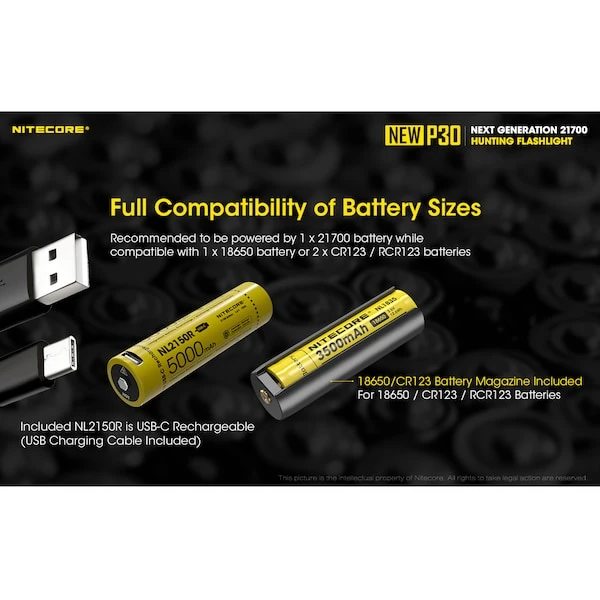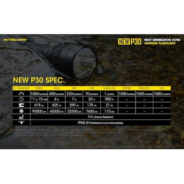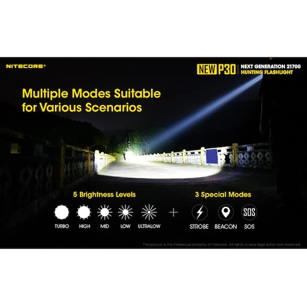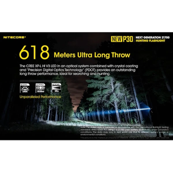 The NITECORE NEW P30 is the ultimate long throw flashlight — great for hunting or search and rescue. The NEW P30 comes with a 1000 lumen beam that can reach up to 676 yards of throw, pointed straight up the beam would be the 3rd tallest building in the world. The NEW P30 is a long range lighting solution with intuitive controls for easy operation. Tap the tail switch for momentary-on or fully depress for constant illumination. While the light is on, tap the mode button to cycle through brightness settings, or hold down to access your special modes: strobe, beacon, SOS.When paired with the included 5000mAh 21700 rechargeable battery, the NEW P30 is capable of up to 40 days of extended runtime with over an hour on turbo. It is also compatible with 18650 batteries, or a pair of CR123A when using the included battery sleeve. Built from durable aero grade aluminium alloy and rated IPX8 waterproof, the NEW P30 is a great all weather tool for long range lighting needs. Grab a NEW P30 for your next long distance hunting, exploring, or search expedition.