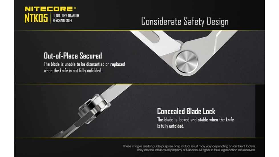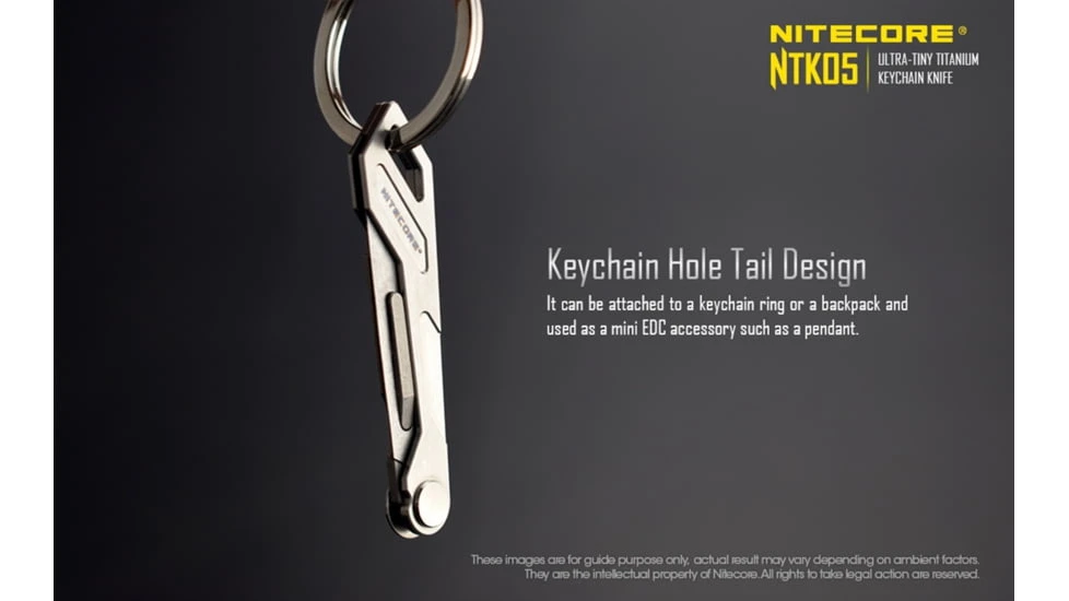 For all the times when precision matters more than power there is the Nitecore NTK05 titanium keychain scalpel blade knife. This exquisitely CNC crafted titanium scalpel blade is made of TC4 aerospace grade titanium; it offers incredibly high strength, durability, low density and corrosion resistance. The NTK05 is everyday carry ready with a built in keychain hole on the grip. Experience all the benefits of an ultrasharp scalpel blade with the compact design of a folder, weighing under 5 grams and 4 inches once opened. The NTK05 is perfect for all utility cutting tasks: box cutting, package opening, rope incising. When youre done, you never need to worry about a dull blade with the NTK05 as it takes standard no. 11 scalpel replacement blades. A concealed blade lock secures the NTK05 in place when completely unfolded to keep you and your fingers safe. The NTK05 ensures the blade cannot be removed or dismantled while the the blade is fully extended for an added peace of mind. Once locked the blade retention device ensures a level and steady blade ready to tackle any cutting tasks.![]()