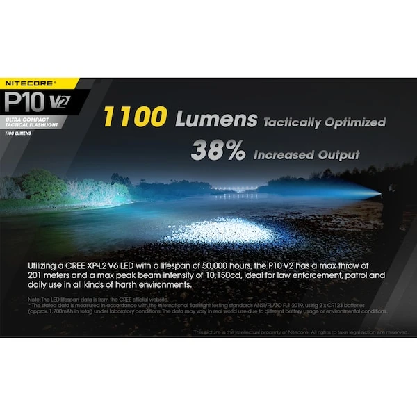 The NITECORE P10 v2 is the compact tactical flashlight you have been waiting for. This 1100 lumen flashlight reaches up to 220 yards of throw distance with a Cree XP-L2 V6 LED. Designed for military, tactical, and hunting uses, the P10 v2 has a dual-switch tailcap for one-handed operation with direct access to strobe. The light can further be easily customized with three operating modes including the tactical mode, law enforcement mode and daily mode for different usage scenarios.The P10 v2 operates on a single 18650 battery or 2x CR123A batteries, incredibly versatile and widely compatible. This flashlight is constructed using aero-grade aluminum with diamond knurling in key locations for enhanced grip. Additionally the P10 v2 maintains an even 1” diameter for easy handling, and is lightweight enough for daily carry with the included NTH10 hard holster. Complete with an all-weather applicable IP68 rated waterproof frame, the new P10 v2 just might outlast all of us.