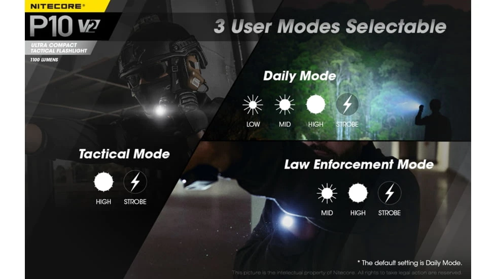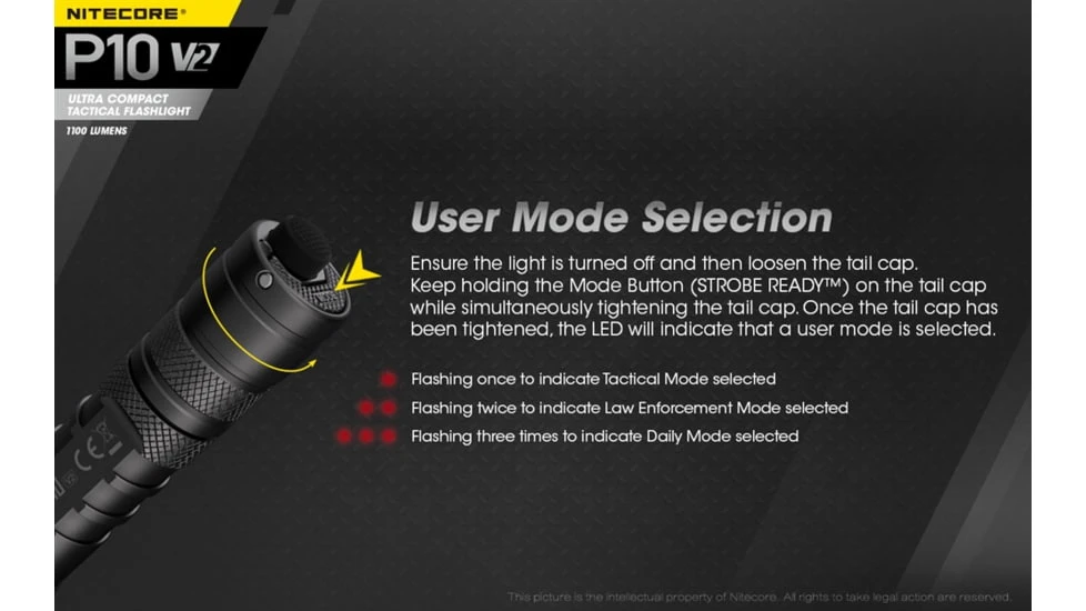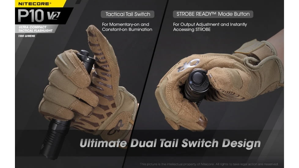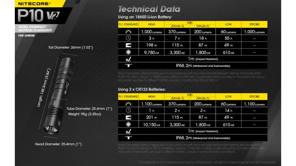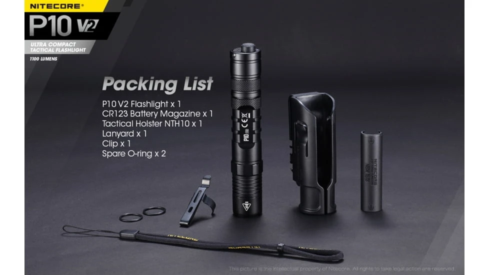 The Nitecore P10 v2 is the compact tactical flashlight you have been waiting for. This 1100 lumen flashlight reaches up to 220 yards of throw distance with a Cree XP-L2 V6 LED. Designed for military, tactical, and hunting uses, the P10 v2 has a dual-switch tailcap for one-handed operation with direct access to strobe. The light can further be easily customized with three operating modes including the tactical mode, law enforcement mode and daily mode for different usage scenarios. The P10 v2 operates on a single 18650 battery or 2x CR123A batteries, incredibly versatile and widely compatible. This flashlight is constructed using aero-grade aluminum with diamond knurling in key locations for enhanced grip. Additionally the P10 v2 maintains an even 1 inch diameter for easy handling, and is lightweight enough for daily carry with the included NTH10 hard holster. Complete with an all-weather applicable IP68 rated waterproof frame, the new P10 v2 just might outlast all of us.![]()