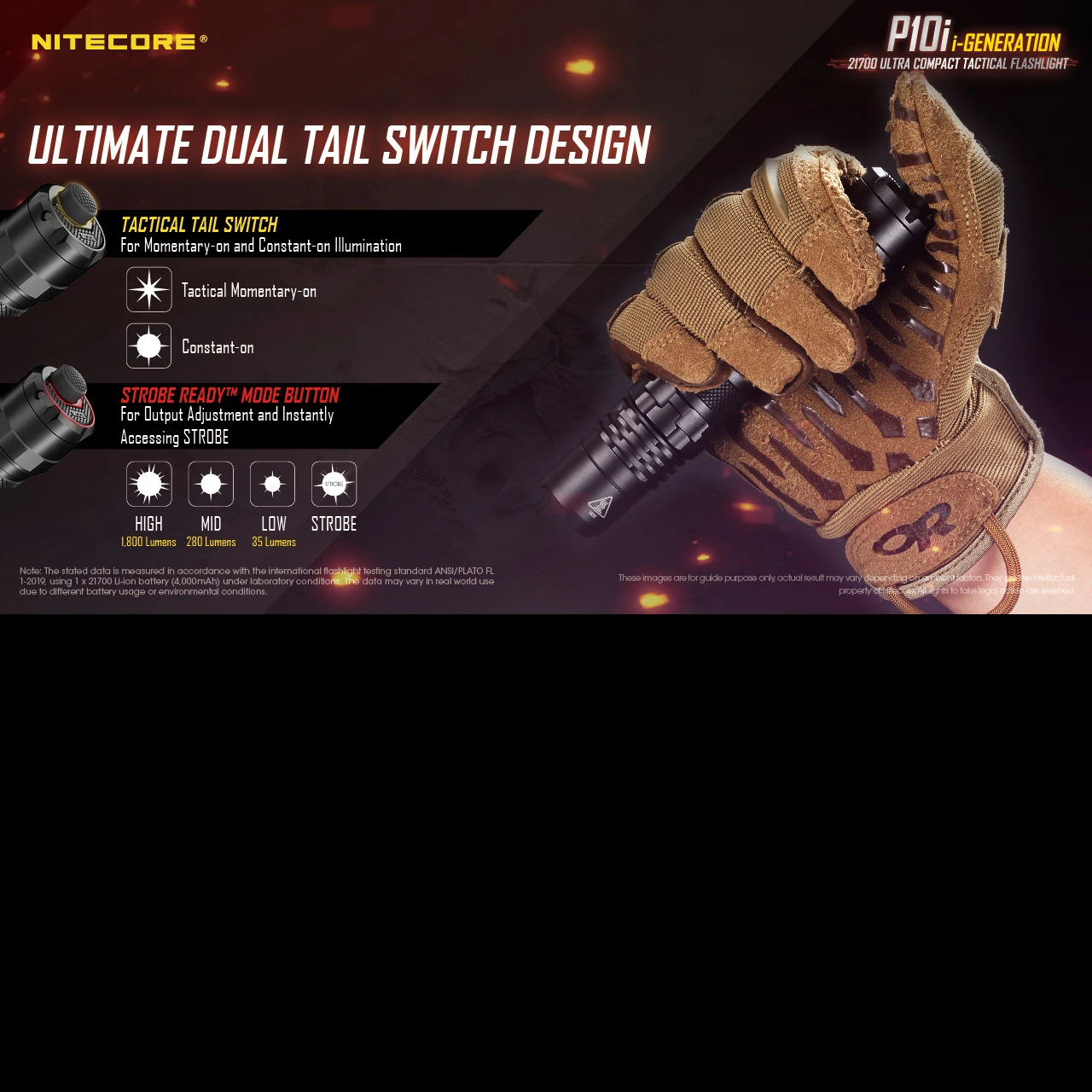 The Nitecore P10i tactical flashlight offers a maximum output of 1800 lumens from the Luminus SST-40-W LED and is powered by an included dedicated i-Series 21700 li-ion NL2140i battery. If you prefer to use a different battery, the P10 is also compatible with 2 x CR123 or RCR123 batteries when using the included battery magazine.