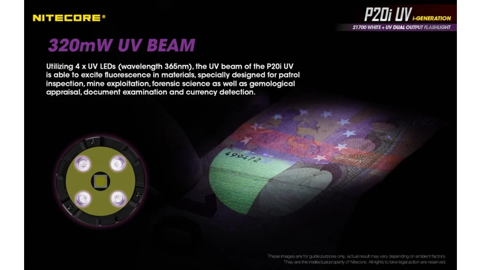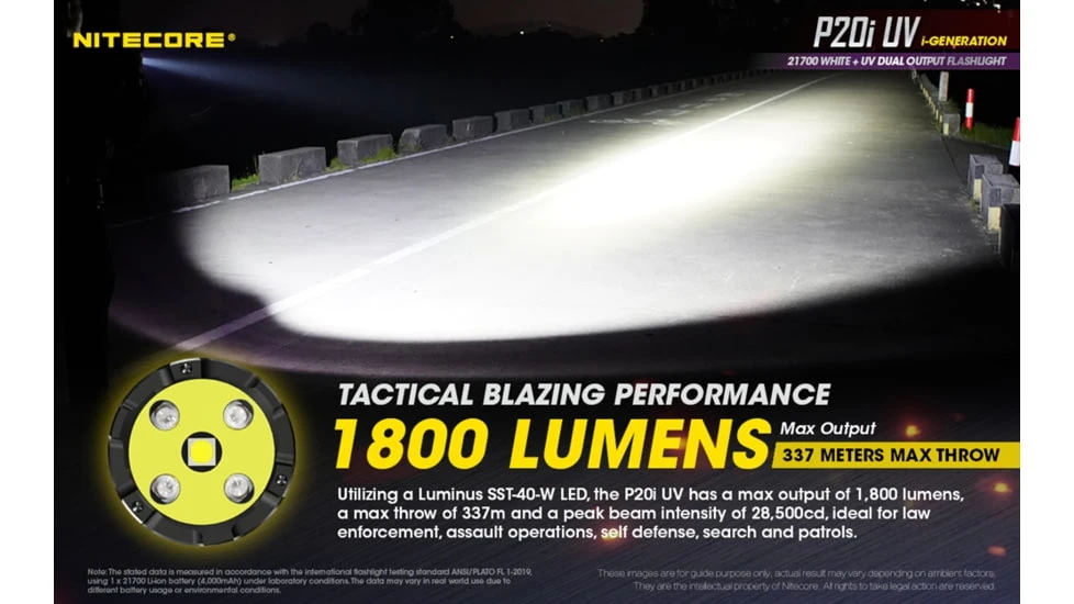 The NITECORE P20i UV is the ultimate high performance tactical flashlight designed for law enforcement and military personnels. It emits up to 1800 lumens with a max throw of 368 yards along with a 320mW UV light. The UV beam illuminates fluorescence in materials, specially designed for patrol inspection, forensic science, and currency detection. Just press and hold the mode switch on the tail to enable the strobe mode at any time. Cycle through the 4 brightness levels and the UV mode by short pressing the mode button when the light is turned on. Mode memory ensures that the same output is activated when the flashlight is turned back on. The P20i UV runs on an upgraded 21700i battery, achieving 1 hour on high and a max runtime of 18 hours on low. Recharge the P20i UV via its fast charge USB-C port. It can also be powered by CR123A batteries as a backup. With an IP68 waterproof rating and a covered charging port, the P20i UV can be used safely in any climate. Includes a NTH20 tactical holster and is compatible with police duty belts and standard MOLLE systems, making it an ideal choice for security, police, or military personnel. Surprises on duty can be dangerous, be ready for anything with the P20i!![]()