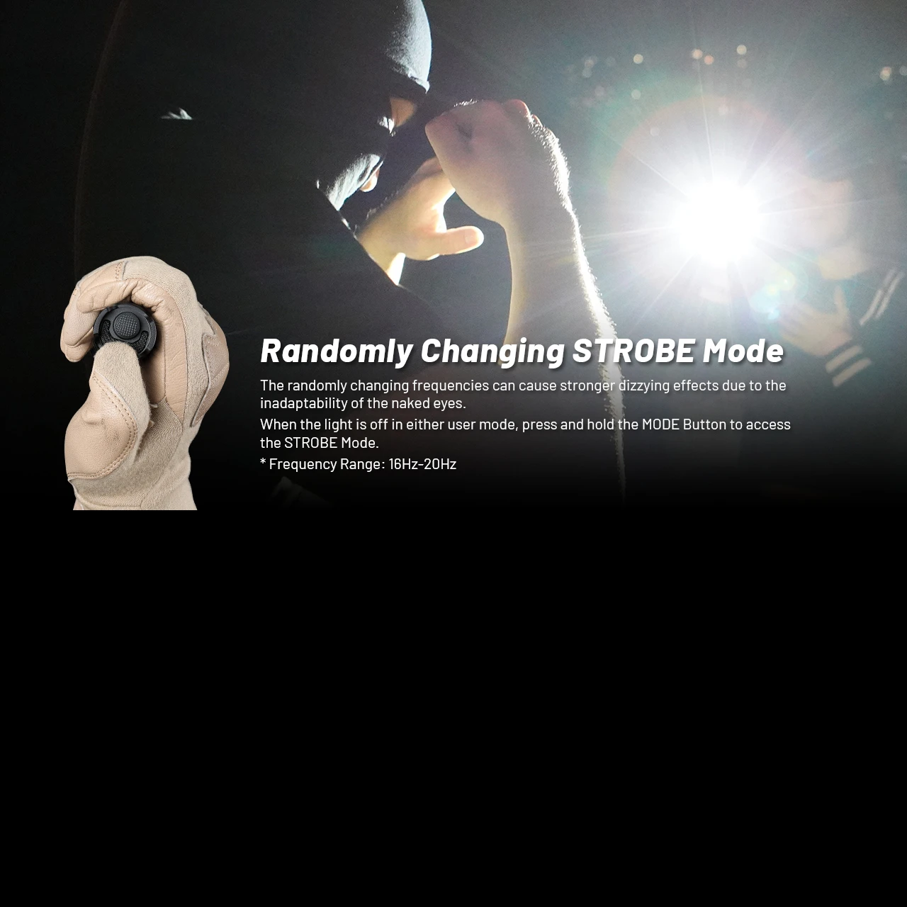 The torch has Nitecore’s 2nd generation Strobe Ready technology with instant access to strobe mode with an inset mode switch to avoid accidental activation. The output has a randomly changing frequency between 16Hz and 20Hz, for emergency use. The tactical U-shaped tail cap also offers tail stand capability and can be used with a wrist lanyard (included).