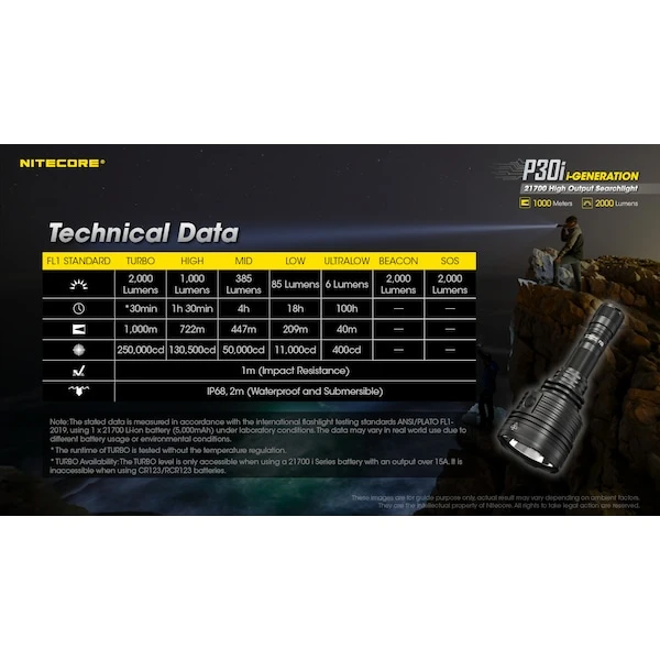 The Nitecore P30i is the ultimate long throw flashlight that cuts through the fogs and wild and reaches far away in distance, great for hunting or search and rescue. The P30i emits a 2000 lumen beam that can reach up to 1093 yards of throw, making it one of the longest throwing flashlights. The P30i comes with intuitive controls for easy operation. Half press the tail switch for momentary-on or full press for constant illumination. While the light is on, tap the side button to cycle through your brightness settings.Paired with the included 5000mAh 21700 iSeries rechargeable battery, the P30i is capable of up to 100 hours of extended runtime. The protected USB-C port can be used to charge the flashlight or connect the pressure switch for remote control when mounted. Built from durable aero grade aluminium alloy and rated IP68 waterproof, the P30i is a great all weather tool for long range lighting needs. Grab a P30i for your next long distance hunting, exploring, or search expedition.