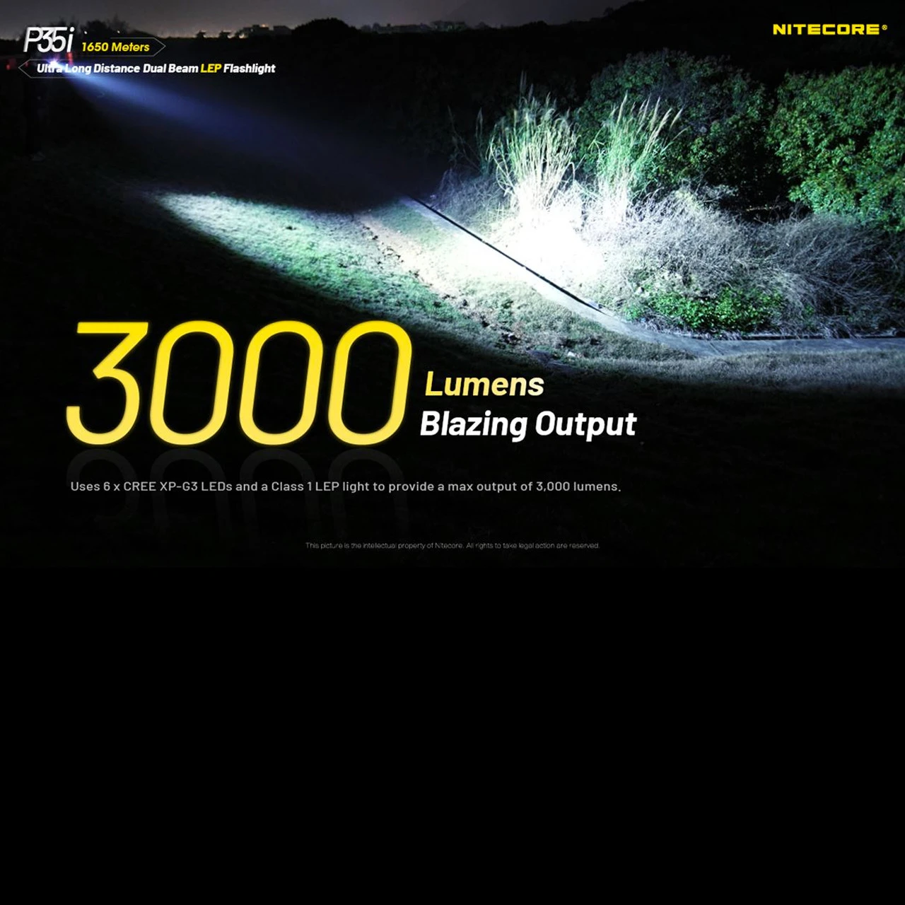 The Nitecore P35i flashlight has a maximum output of 3000 lumens from the 6 x Cree XP-G3 LED (flood mode) and is powered by 1 x 21700 i Series battery (Nitecore NL2150HPi included). The torch is rechargeable via a USB-C port at the base of the light for fast, efficient charging.