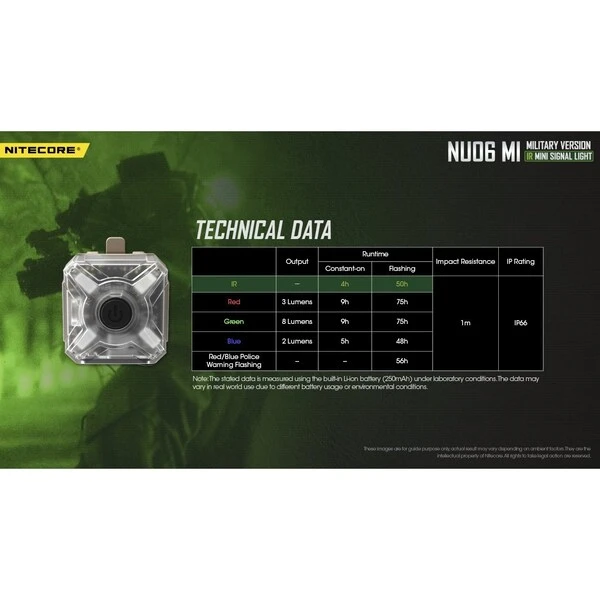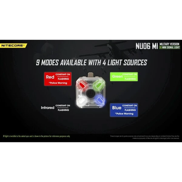 The NU06 MI is a mini LED safety and signal light specifically designed for outdoor activities and law enforcement personnel. It comes with four LEDs in a compact X formation: IR, blue, green and red. Each LED can be activated on a constant-on, a flashing mode, and a setting allows for red and blue LED flashing as a warning signal. The IR LED allows for signaling and identification with special night vision equipment and gear. The NU06 MI on its own is arc rail compatible yet still comes with 3 lightweight brackets: a flat magnetic bracket for metal surfaces, a curved bracket for hook-and-loop surfaces, and a four way MOLLE system bracket. Now the NU06 MI is capable of being attached to literally every surface, from tactical bags, helmets, hook-and-loop patches, MOLLE systems on vests and armor, and anywhere else you can think of.The NU06 MI is ultra lightweight and has a protected USB-C charging port. The upgraded internal battery is twice as big as the NU05 LE. Enjoy up to 75 hours of runtime at full charge. It has a battery life indicator as well as a charging status indicator so you are always ready for action. Made of tough high quality PC material, this lightweight signal LED is only 0.56 ounces. The NU06 MI is impact resistant up to 1m and IP66 waterproof rated making it ready for any outdoor environment.