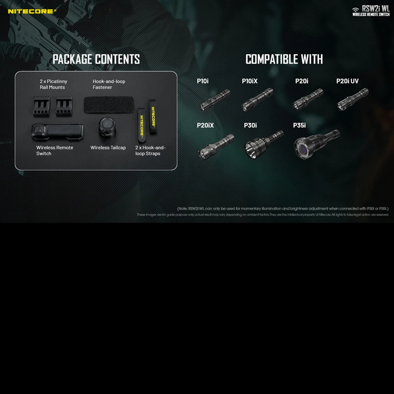 The Nitecore RSW2i WL is a wireless remote switch that is specifically designed for the Nitecore i series of torches which include the P10i, P10iX, P20i, P20i UV, P20iX, P30i and P35i.
