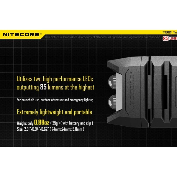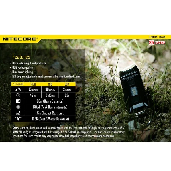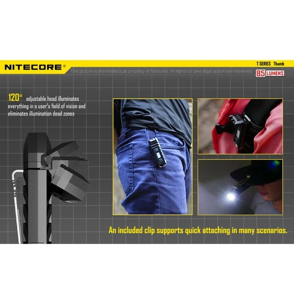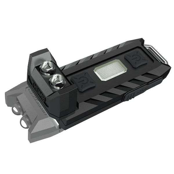 The NITECORE THUMB is a lightweight, versatile keychain flashlight using two high performance LED to emit up to 85 lumens with three brightness levels. The adjustable head of the THUMB can be angled within a 120 degree range for directed lighting while working on household chores, camping and in emergencies. The THUMB also includes a secondary red LED for preserving night vision and emergency signaling. Easily recharge the THUMB via the conveniently located micro USB charging port. Fully charged, the built-in li-ion battery provides up to 22 hours of runtime. Constructed from polycarbonate materials to withstand heavy usage, the THUMB includes a metal rear suspension ring capable of withstanding 77lbs of weight.