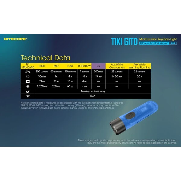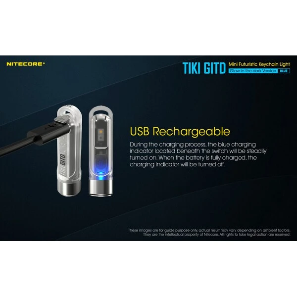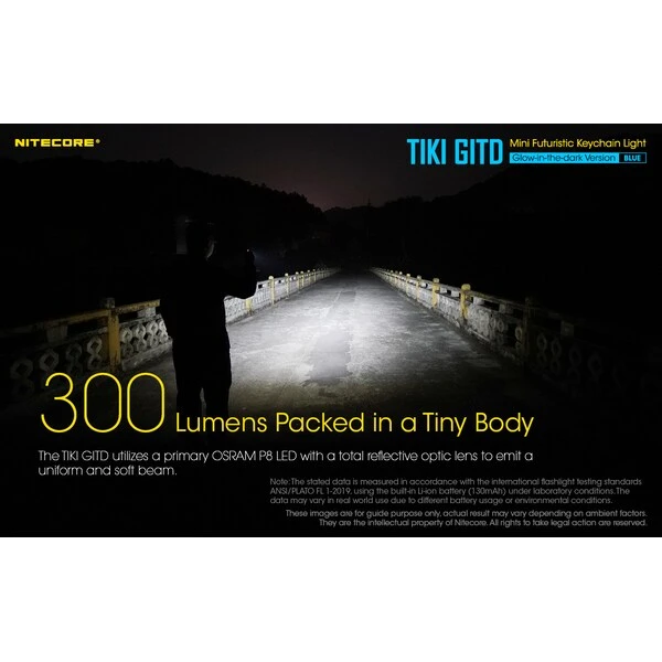 The NITECORE TIKI GITD puts the power of 300 lumens with a reach of 77 yards at your fingertips. Weighing about 0.42 ounces, this ultra lightweight mini keychain EDC light has a simple user interface that grants access to 3 light sources: white light, UV light, and high CRI light. The UV light is essential for stain, fake ID and counterfeit bill detection for security personnel, while the high CRI white light is ideal for reading and camping.The TIKI is USB rechargeable and comes with a built-in battery, making it convenient to maintain. At the lowest mode, it can run for up to 40 hours on a single charge. Made from durable PC materials with a stainless steel alloy head, the TIKI boasts an IP66 rating, ensuring that this little guy can be used as a solid everyday carry flashlight day in and out, in any weather condition. The phosphorescent shell allows the TIKI GITD to glow in the dark after just one second of exposure to the sun or another source of UV light.