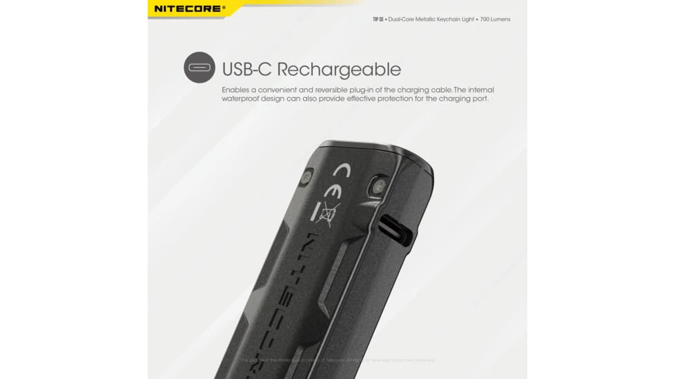 The Nitecore SE’s dual LEDs double the power to 700 lumen while maintaining the compact size and stylish design of the original Tip. That translates to over 100 yards of throw and illumination from a thumb-sized keychain light. The entire unit weighs less than a single ounce, so when paired with the included adjustable pocket clip, you have an ideal EDC companion. Here to stay is the intuitive dual button design making the Tip SE a must have accessory for any keychain, emergency kit, or outdoor set. Its built-in USB-C fast charging capability fully juices the Tip SE in under 1.5 hours and provides over 50 hours of effective runtime per charge. The led underneath the power button functions as a battery level and charging status indicator. With multiple built-in charging safeguards and an IP54 weather resistant rating the Tip SE is very durable for daily use.![]()