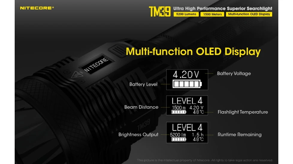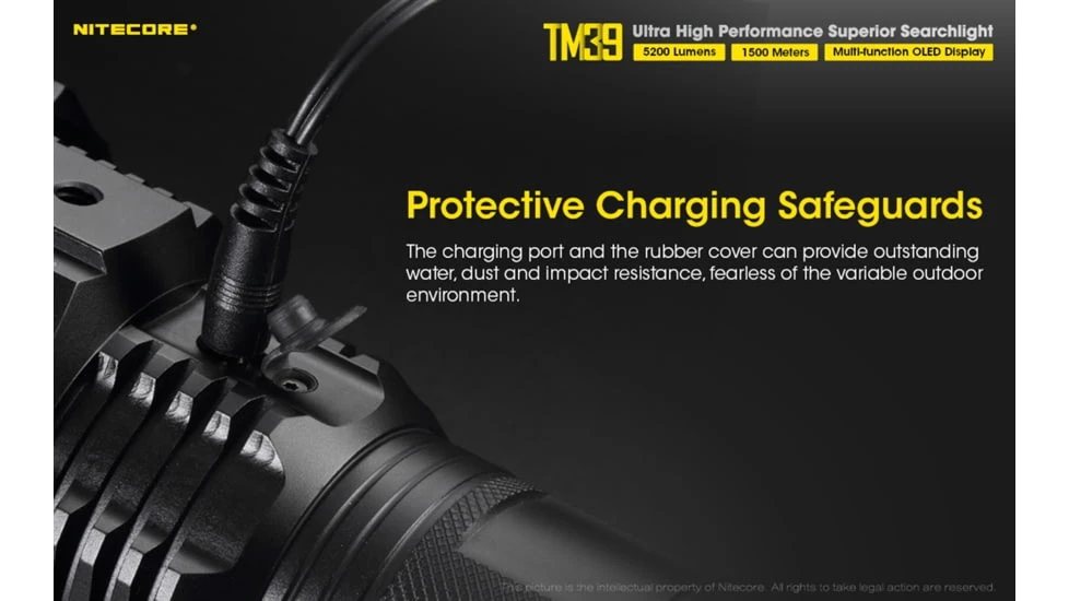 At 5200 lumen and 1640 yards of throw, NITECORE brings the Tiny Monster series back in full force with one of the most powerful long throw flashlights available. This high-performance searchlight features a state-of-the-art luminus sbt-90 gen 2 LED that powers this monster to almost a mile of throw, which makes it ideal for hunting, exploration, search and rescue. Choose between four brightness settings for all your needs and direct access to turbo and low for convenience. With a conveniently located dual button user interface, the TM39 is easy to operate and puts the power in your hands. An onboard OLED display reports real-time information about output, battery status, estimated runtime, and operating temperature. Powered by an NBP68 HD battery pack, the TM39 has up to 36 hours of runtime. When it’s time to charge, use the included AC adapter to directly charge your battery pack or the TM39 directly. The OLED display will inform you of the charging status. There is nothing to fear on your next adventure, when the monster is already on your side; the NITECORE TM39.![]()