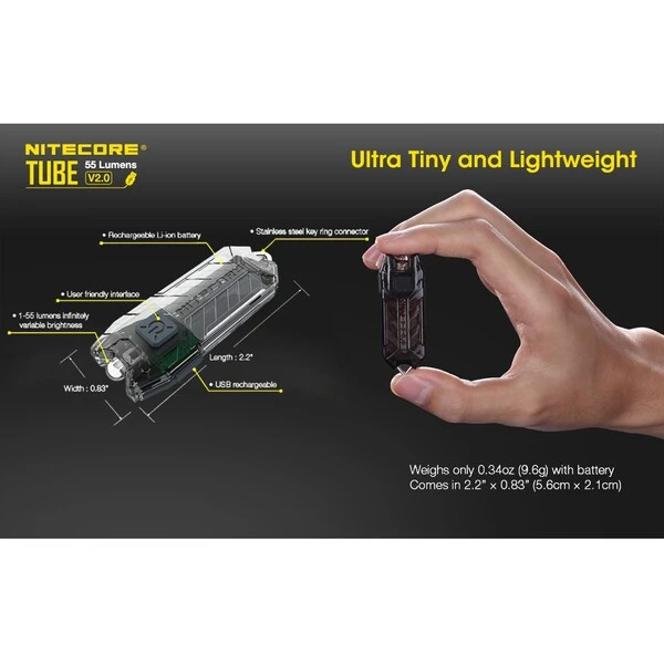 The popular NITECORE Tube keychain flashlight 2nd generation is here with 55 lumen brightness, faster charging, and an improved lockout function. Look no further than the NITECORE Tube v2.0 for a lightweight EDC keychain flashlight. Designed to be ultra compact and lightweight, it is so easy to carry that you might forget it. At just 0.34 ounces, the Tube v2.0 weighs about one-tenth of typical car key. A familiar car key fob shape, the Tube v2.0 is just 2.2 inches in length and under an inch wide. Available in multiple colors the Tube v2.0 adds a personal touch to your EDC.The new Tube v2.0 is great whether you want to use it everyday, or occasionally. Perfect for storing in emergency kits, or survival gear, the Tube v2.0s ultra low-drain circuitry is capable of a full year on standby current. Easily adjust the output of the Tube v2.0 to your needs with its variable brightness. Just hold the power button and the light goes from 1 to 55 lumen so it is bright enough for household tasks, outdoor use, and everything in between. Enjoy up to 58 hours of runtime on a full charge, easily done by plugging a common micro USB cable into the Tube v2.0. Add function not weight or bulk to your keychain with the Tube v2.0.