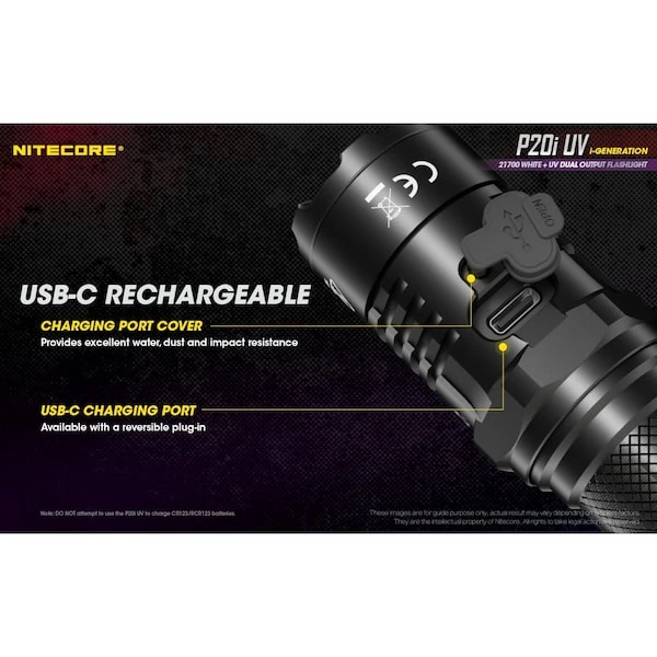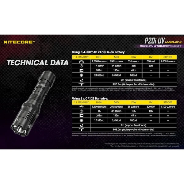 The NITECORE P20i UV is the ultimate high performance tactical flashlight designed for law enforcement and military personnels. It emits up to 1800 lumens with a max throw of 368 yards along with a 320mW UV light. The UV beam illuminates fluorescence in materials, specially designed for patrol inspection, forensic science, and currency detection. Just press and hold the mode switch on the tail to enable the strobe mode at any time. Cycle through the 4 brightness levels and the UV mode by short pressing the mode button when the light is turned on. Mode memory ensures that the same output is activated when the flashlight is turned back on.The P20i UV runs on an upgraded 21700i battery, achieving 1 hour on high and a max runtime of 18 hours on low. Recharge the P20i UV via its fast charge USB-C port. It can also be powered by CR123A batteries as a backup. With an IP68 waterproof rating and a covered charging port, the P20i UV can be used safely in any climate. Includes a NTH20 tactical holster and is compatible with police duty belts and standard MOLLE systems, making it an ideal choice for security, police, or military personnel. Surprises on duty can be dangerous, be ready for anything with the P20i!
